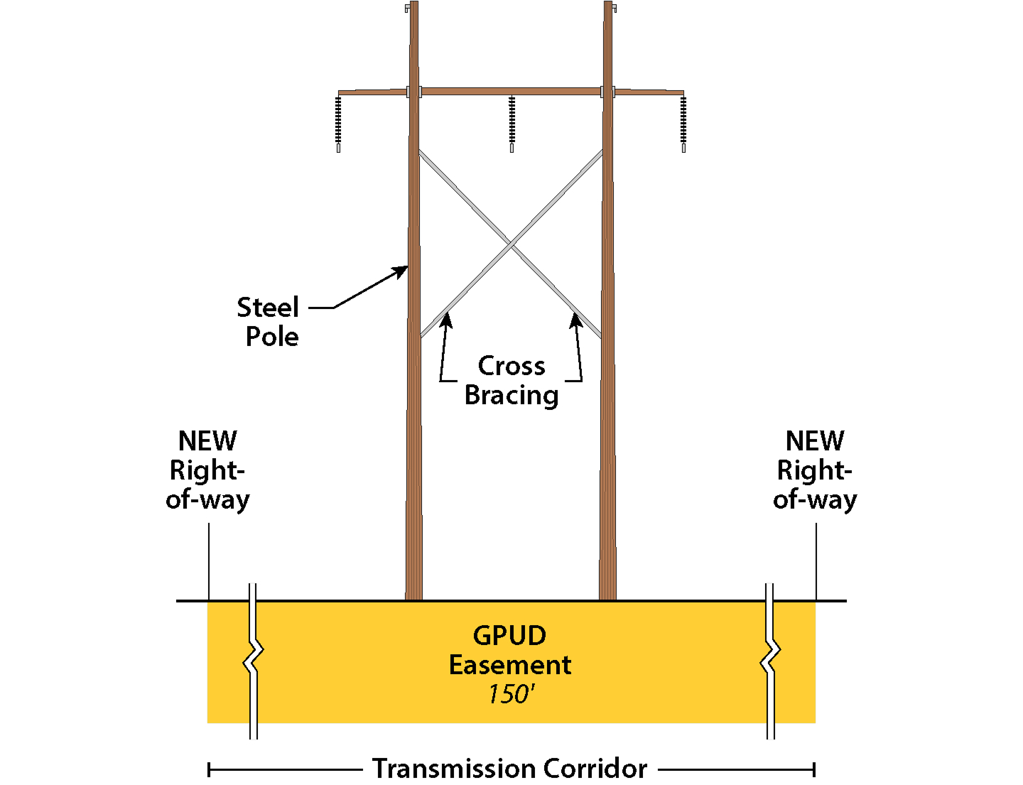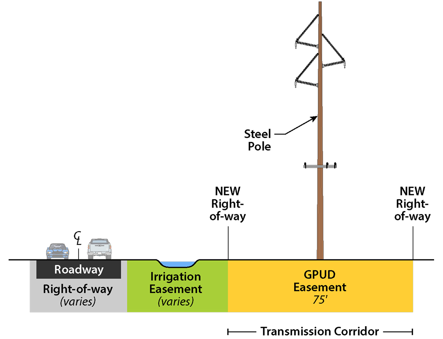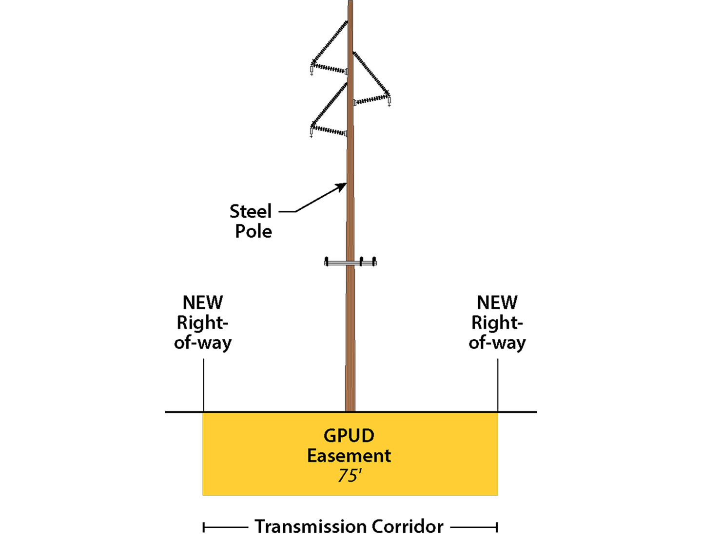 Right-of-way acquisition gives permanent easement rights to Grant PUD to use the land or property to build and maintain the transmission line. Landowners are paid for the use of the land and retain ownership of the land, but they give Grant PUD permission to use the land indefinitely. If the property is sold, the new owner is bound to the terms of the easement. In most cases, Grant PUD will seek to acquire a small corridor of land, just enough to place poles on the property and for the wires attached to the poles. In addition to still owning the land, landowners can use the land except for a small area around the poles. There are some limitations to what can be placed under the lines that will run between the poles. For example, buildings or trees would not be allowed.