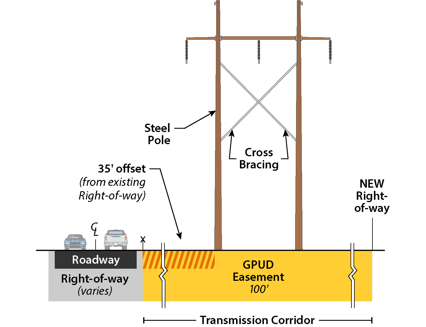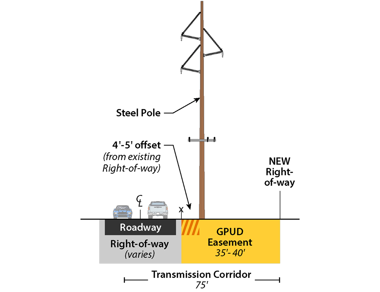 Grant PUD has yet to propose the locations of the poles. During subsequent planning phases, Grant PUD will develop conceptual designs that will provide information such as proposed angle locations and the side of the road on which the lines could potentially be located for the selected routes. The subsequent phases of the design process will determine the requirements for new or expansion of existing easements.